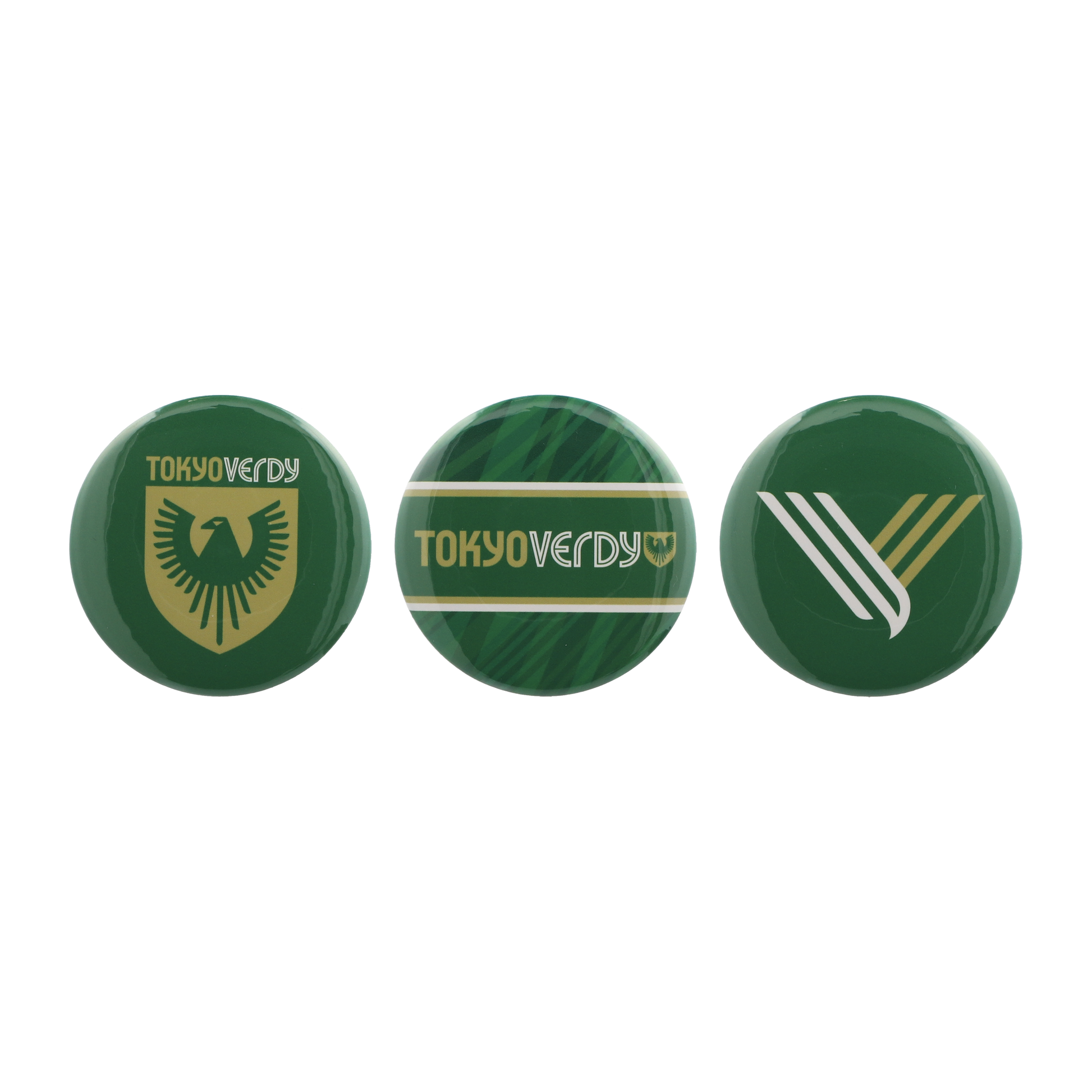 エンブレム、ロゴ、Vマークがそれぞれデザインされた缶バッチセットです。